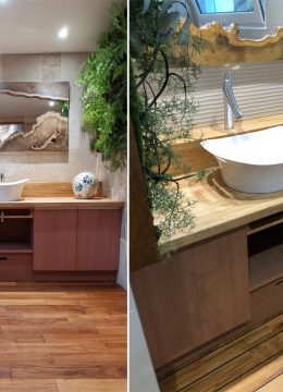 Meuble sous vasque en hévéa et louro faiai à Lacanau